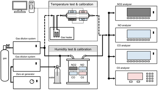 Laboratory setup for sensor linearity, cross sensitivity, and zero air drift test.