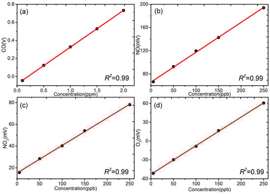 Figure 2 shows the correlation between raw outputs voltage from sensors and standard gas concentration measured using regulatory grade air monitors that served to produce a reference value for the pollutants of concern. Each data point represents the average of 10 min values for each concentration step. As expected, the sensors demonstrated high linearity with specific gas, and R2 values are higher than 0.99 for all 4 pollutants, consistent with our prior studies and those reported by others [17,21,34,35]. However, the linearity response of sensors was determined once stable environmental conditions were established after sensor “stabilization”. This demonstrates that the electrochemical sensors perform well under ideal conditions.