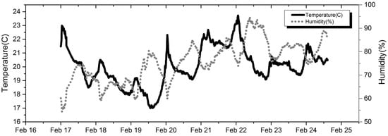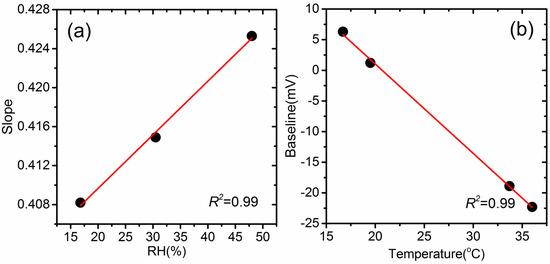 For practical application, variations in temperature and relative humidity have been shown to impact sensor output. Based on the test results from this study, S and B in Equation (1) can be generalized by the following simple linear equations, as illustrated in Figure 3: