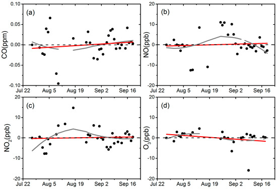 Zero air test for sensor drift evaluation for CO (a), NO (b), NO2 (c), O3 (d), a linear fitting (red line) and loess smoother (gray line) was added.