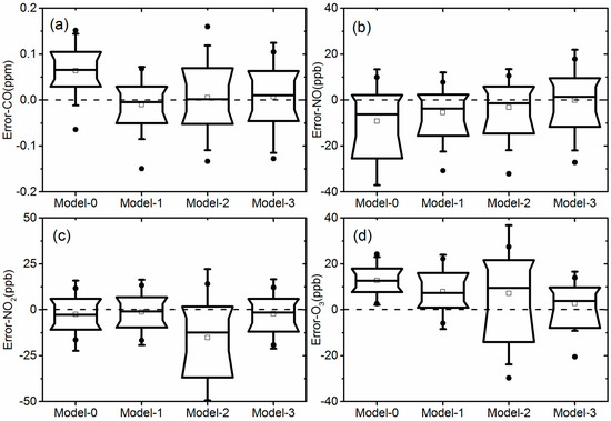 Box plots of error distribution of 4 models: (a) CO, (b) NO, (c) NO2, (d) O3.