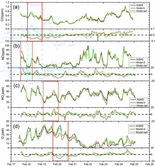 The comparison of hourly AQMS (Air Quality Monitoring Station) and sensor data (upper panel) and the errors of uncorrected Model 0 and optimal Model (lower panel) (a) CO, (b) NO, (c) NO2, (d) O3. The red rectangle represented the largest deviation period of the 2 models compared.