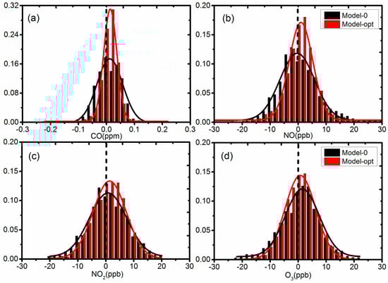 Histogram of errors from Model 0 and optimal Model fitted with normal distribution curves (a) CO, (b) NO, (c) NO2, (d) O3.