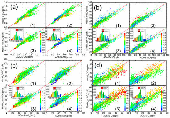 Scatter plot of AQMS and sensor data by Model 0 and corrective Model-opt. (a) CO, (b) NO, (c) NO2, (d) O3. Insets represent the cumulative errors in each temperature and relative humidity bin. Subplots 1 and 3 are color categorized plots by temperature for Model 0 and Model-opt, respectively. Subplots 2 and 4 are color categorized plots by relative humidity for Model 0 and Model-opt, respectively.