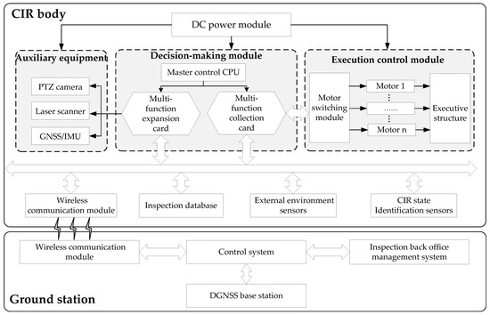 A structural diagram of the autonomous inspection system is shown in Figure 1, which is composed of a CIR body and a ground station. The CIR body part can be divided into a DC power module, a decision-making module, a control module, auxiliary equipment, a wireless communication module, an inspection database, external environment sensors, and CIR state identification sensors. The decision-making module is an industrially controlled computer system based on the PC104 bus to exchange data and communicate instructions through the bus and the multi-function card. The control module completes the control of motors. The auxiliary equipment includes a PTZ camera, a laser scanner, and DGNSS/IMU combination navigation. The inspection database stores all kinds of data, e.g., prior information on the transmission line, robot operation data, inspection target parameter information, inspection target images, etc. The sensors are divided into two categories: external environment detection and robot status identification, which ensures autonomous operation of CIR on the ground wire. The ground station is composed of a DGNSS base station, a control system, a back office management system, and a wireless communication module. The CIR body and ground station communicate wirelessly and are remotely monitored.