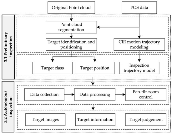 - The proposed method mainly includes two inspection steps. The preliminary inspection can find the abnormal points through point cloud distribution, and use a hierarchical classification strategy to determine their classes and 3D positions. The autonomous inspection can generate the inspection sequences according to the inspection target information obtained in preliminary inspection, operate CIR to reach the specified points in accordance with inspection planning, and take images of the inspection targets with the PTZ cameras. Therefore, in the post-processing phase, it is no longer necessary to extract useful information from the many inspection images or videos, but only to make a final judgement by contrasting images at specified points and preliminary inspection results. This method can effectively improve the intelligence level of the current transmission line inspection, greatly reducing manpower and improving inspection accuracy.