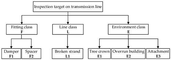 The purpose of the inspection is to check fittings (e.g., dampers, spacers) on a transmission line to find abnormal points and assess the surrounding environment of lines, which enables power personnel to quickly arrive at the fault points for maintenance. The inspection target on a transmission line is generally classified into three kinds, as shown in Figure 5.
