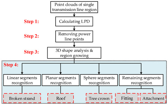 For a point cloud of a single transmission line, a hierarchical classification strategy is used to identify different inspection targets using the distribution characteristics of a point cloud and the geometric characteristics of targets. The algorithm flow is shown in Figure 6.