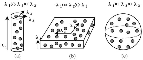 Step 3: Use local neighborhood statistics derived from principle component analysis (PCA) to analyze the spatial distributions of the residual point clouds. The optimal neighborhood radius of each point is determined by the neighborhood adaptive method [33]. The data in the neighborhood are adopted PCA to obtain the eigenvalues of the local point cloud, ,,. The distributions of different target eigenvalues have obvious differences, determining the spatial distribution of the local point cloud. The relationships among these three eigenvalues indicate the distributions of the 3D points: if , the points are linear distribution; if , the points are planar distribution; if , the points are discrete distribution as illustrated in Figure 7 [34,35].
