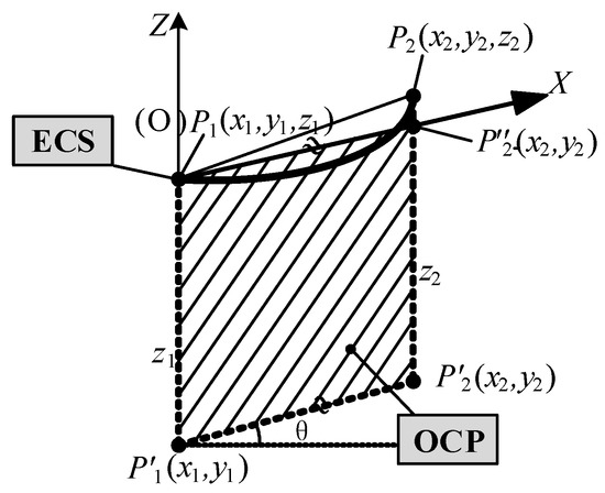 The suspension points (i.e., P1 and P2) of the ground wire on the tower are determined by point cloud segmentation using the POS data, as illustrated in Figure 9. In a span segment, the suspension point of litter-number tower P1 is considered as the origin O of the engineering coordinate system (ECS); the elevation of POS data is applied as the Z-axis of ECS. The two suspension points (P1 and P2) are projected to the horizontal plane, generating two points (P1′ and P2′). The optimal coordinate plane (OCP) can be determined by lines P1′P2′ and P1P1′. In OCP, the line P1P2′’ is parallel to the line P1′P2′ through point P1, intersecting line P2P2′ at point P2′’. The line P1P2′’ is defined as the x-axis of ECS.