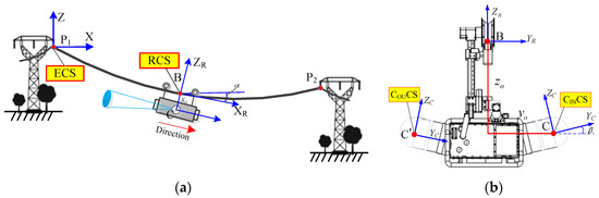 Inspection coordinate system is built in order to parameterize CIR’s position on a transmission line relative to the reference point and its own state, which mainly includes four coordinate systems, i.e., the reference point, CIR body, and the two PTZ cameras, as shown in Figure 10. Through the mathematical relations between each coordinate system, CIR can be executed the pose transformation and control the position of CIR in real time.