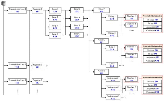 The database structure of the waiting-inspection targets is based on the prior information of transmission line and the results of preliminary inspection, as shown in Figure 11. CIR inspects different lines: Transmission Line 1, Transmission Line 2, etc. For any one of the lines, the transmission line is divided into Segment 1, Segment 2, etc. Segments is divided into Loops 1–4. A loop is composed of a ground wire, A-phase, B-phase, and C-phase. The waiting-inspection targets include fitting class, line class, and environment class. Each waiting-inspection target is assigned a number by certain rules. The numbered waiting-inspection targets have associated information, such as position (PO), image (IM), judgment (JU), comment (CM), etc.