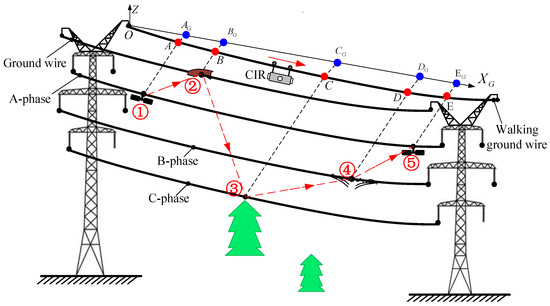 Step 2: The mathematical model of transmission line is catenary. If the collection spacing is small enough, CIR walking mileage can be considered an arc. The coordinate of CIR relative to ECS can be defined as in Equation (6):