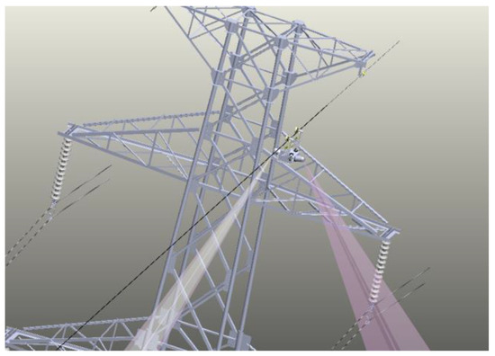 To verify the feasibility of the proposed method, we carried out many experiments on the actual line, which is located in the Changbai Mountains, Jilin Province. The actual lines are loaded with 220 KV (high voltage). The autonomous inspection system integrating a CIR LiDAR system and PTZ cameras is transported on the walking ground wire through the automatic up-line device, as shown in Figure 19. There are five transmission lines on the tower in Figure 20: two ground wires at the top layer and the three-phase transmission lines under the same side of the walking ground wire. Targets 1–3 is the three dampers on the transmission lines in k span segment. There are no other abnormal conditions (e.g., attachment, broken strand) in the segment through observation.