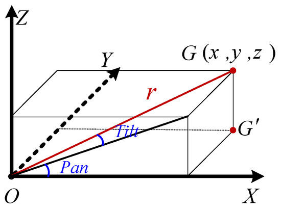 Step 5: Calculate the motion adjustment parameters of PTZ camera. The PTZ camera has two rotation degrees of freedom, as shown in Figure 15. The G point is the inspection target. Equation (7) is the adjustment parameter model of the PTZ camera.
