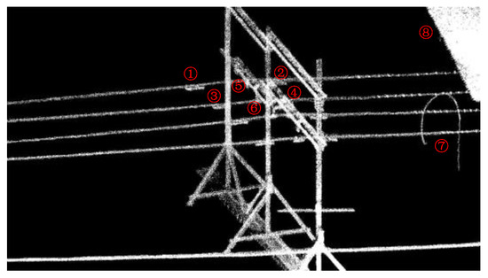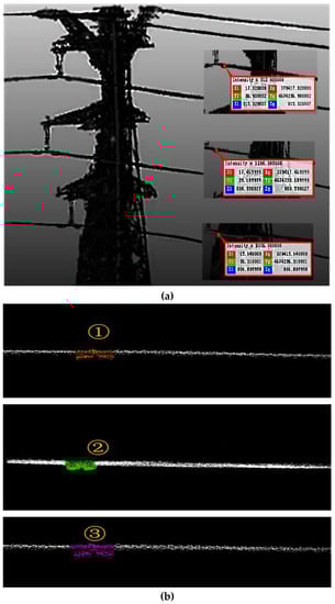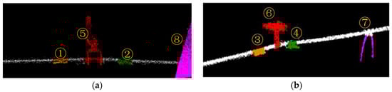 The point cloud is separated into each line based on the POS data. The spatial distribution and geometrical structure of the point cloud are used to identify and locate the inspection targets on Lines 1 and 2. Figure 18 illustrates the classification point clouds of these inspection targets on Lines 1 and 2.