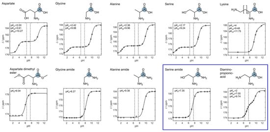 Natural amino acids exhibit pH-dependent carbonyl carbon chemical shifts around the pKa values of their carboxylic acid, their amino and their side chain groups. However, these pKa values do not lie in the pH range that is useful for MR pH imaging, and the carbonyl chemical shift sensitivity of natural amino acids is small in that range (even for His and Cys). The physiological pH of blood and most bodily fluids is between pH 7.35 and pH 7.45 (up to pH 7.6), and diseases such as cancer exhibit an acidic extracellular tissue with pH as low as pH 5.8 [,,,,]. The ideal pKa of an in vivo pH sensor should therefore be around pH 7.0 ± 0.6 in order to achieve maximum pH sensitivity. Amidation or esterification of amino acids removes the carboxylic acid proton and the molecule thus loses the pH sensitivity of its carboxylic acid. In effect, this lowers the pKa of the amino group toward pH values of physiological relevance. The addition of groups with positive inductive effects increases the pKa, which we demonstrated for basic and phosphorylated amino acids and that also applies for dicarboxylic acids, pyridine derivatives [], and most probably for other pH-sensitive molecules like furanones []. On the other hand, addition of moieties or atoms with negative inductive effects (-I) decreases the pKa.