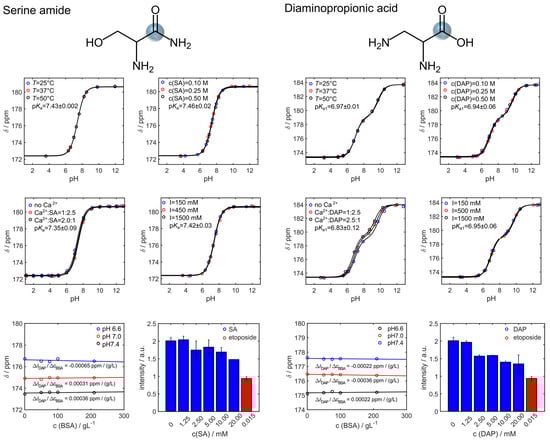 For analysis of the temperature dependency, solutions were measured at 25 °C, 37 °C and 50 °C controlled by an air heating within the NMR spectrometer. DAP and serine amide (SA) concentrations were varied for analysis of the dependency of the sensor concentration on the chemical shift (100 mM, 250 mM, 500 mM). In cases where effects of the ionic strength on the NMR sensitivity was tested, respective amounts of KCl were added, taking the sensor concentration into account. Then, 0.4 and 2.0 equivalents (for SA, 0.4 and 2.5 equivalents for DAP) of CaCl2 were added to solutions containing 250 mM of amino acid to test for potential interaction or complexation of SA/DAP with bivalent metal ions. Chemical shift sensitivity in presence of proteins was tested with increasing bovine serum albumin (BSA) concentrations (0, 50, 75, 100 and 210 g/L) at fixed pH values (pH 6.6, 7.0, and 7.4), which were adjusted after each addition of BSA.