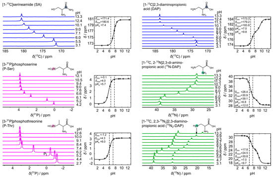 NMR titration curves of P-Ser, P-Thr, 13C-SA, 13C-DAP, 13C-15N-DAP, and 13C-15N2-DAP. 13C (blue), 31P (purple), and 15N (green) NMR pH titration series are shown for the respective amino acid given with their chemical structure. Measured nuclei are marked with filled circles of their respective colors. Fit curves and fitting parameters for pH-dependent chemical shifts are given next to each NMR series. Dashed lines mark the range pH 6.4–7.6. Concentrations of P-Ser, P-Thr, 13C-DAP, 13C-15N-DAP, and 13C-15N2-DAP were 300 mM. For, 13C-SA, a 100 mM solution was measured. 13C spectra were referenced to the resonance signal of 250 mM 13C-urea set to 165 ppm. 15N and 31P spectra were reference to the respective spectrometer frequency.