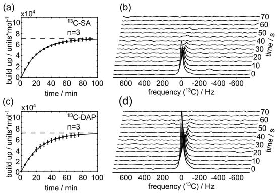 Molar solid-state polarization build-up (a,c) and polarization decay in aqueous solution (b,d) of DAP and SA. The maximum achievable molar solid-state polarization of DAP (a) and SA (c) were measured to 7.12 × 104 u.*mol−1 and 7.06 × 104 u.*mol−1, respectively (from fit, horizontal dashed lines). After dissolution, the decaying 13C NMR signal (b,d) was used to quantify T1 = 13.8 s ± 0.4 s and T1 = 18.8 s ± 2.0 s, for SA and DAP, respectively (B0 = 1 T). The solid build up constants for SA and DAP were 22.5 ± 1.8 min and 24.2 ± 4.1 min, respectively. The build up constant of PA was 15.2 ± 0.5 min. Measured concentrations of DAP and SA were 20.9 ± 1.7 mM (pH 5.3 ± 0.8, n = 3) and 28.5 ± <0.1 mM (pH 5.8 ± 0.4, n = 3), respectively.