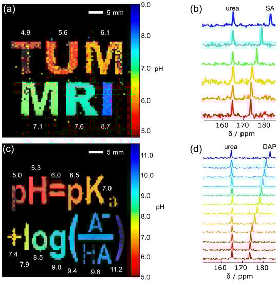 pH maps and 13C-NMR spectra of thermally polarized SA and DAP. 3D-printed, letter-shaped compartments filled with solutions containing 250 mM 13C-SA (a) or 250 mM 13C-DAP (c) both with 250 mM 13C-urea and 2 mM Dotarem at different pH. Chemical shift images were acquired and used to calculate pH maps ((a,c) color) co-registered with T1-weighted 1H images (gray). pH values measured with a pH electrode are written in white next to the respective compartment. NMR spectra of a representative voxel for each compartment are displayed for SA (b) and for DAP (d).
