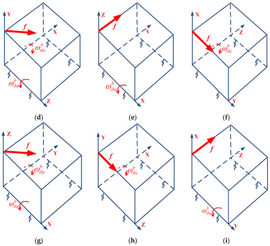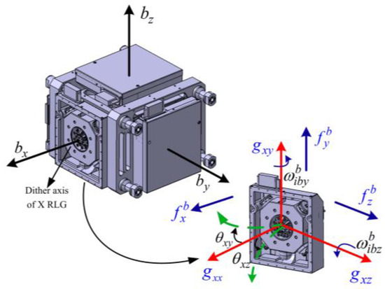 In general, the frame- is parallel to the SINS body frame-b. However, if the specific forces act on the X RLG, the aforementioned two coordinate frames will no longer be parallel. There will be a small angle between them. A rotation vector denoted by can be used to express the rotation from the frame-b to the frame-, and is given by:
