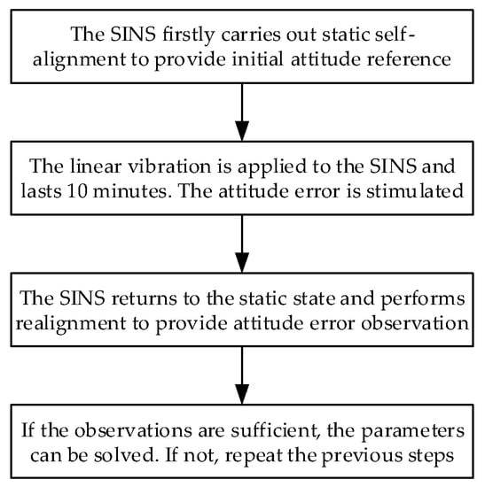 At least 12 different attitude error observations are required to solve the unknown parameters in Equation (17), so several vibration experiments are needed. Figure 2 shows the calibration method process. Considering the limitation of the north-finding accuracy, only the horizontal components of the attitude error observations in Equation (18) are used. Equation (17) can be solved by least squares as follows: