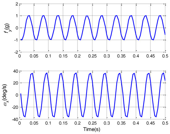 To verify the effect of g-sensitive misalignments compensation, a linear vibration test is conducted. The SINS first carries out the alignment process for 15 min. Then the linear vibration along the Y-axis in the XY plane is applied to the SINS, lasting about 10 min. The SINS works on pure inertial navigation mode during the vibration. Figure 5 shows the details of and within 0.5 s. The curves in this figure are plotted according to the IMU gyro output and accelerometer output. By inspection of the figure, we can obtain the frequency, amplitude, and phase information of and . The frequency of and is 20 Hz. The amplitudes of and are about 1 g and 36 deg/s. Due to the damping effect of the outer rubber dampers, there is a phase difference between and , whose value is about . Hence, the representations of and are given by: