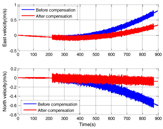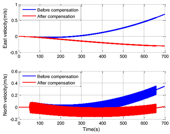 The direct component of Equation (28) is the constant equivalent gyro drift. The value is about 0.05 deg/h, which is a great value for high-accuracy SINS. The equivalent gyro drift will further introduce great velocity error, as shown in Figure 6. After g-sensitive misalignments compensation, the velocity error significantly decreases. The percentage of velocity error decrease is about 61%.