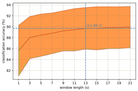 The effect of window length on recognition accuracies was explored deploying an RF classifier with a sufficiently big forest size, 128 trees, as stated in [23]. The classifier was separately trained and tested for feature sets with 1-, 3-, 5-, 7-, …, 21-s window length values. For each window length, the results of LOOCV are sketched in Figure 1. As can be seen, the classification accuracies increased from the 1-s window until the 13-s window, when it plateaus afterwards. The best window length is therefore 13 s, and the results of the next experiments are all based on the feature set with a 13-s window length.