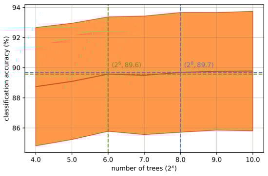Classification accuracy versus the binary logarithm of the number of trees. The shaded areas highlight ± one standard deviation from the mean value.