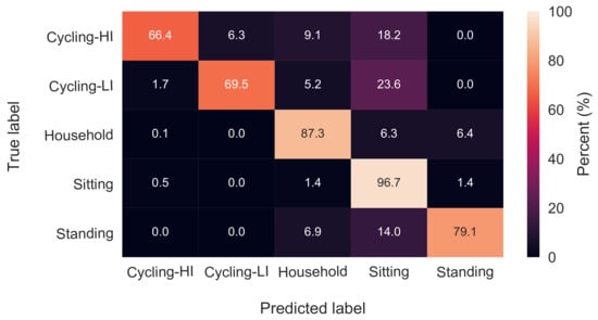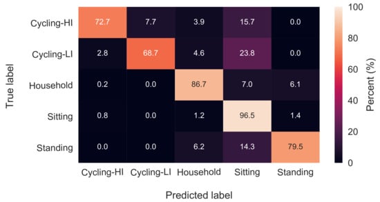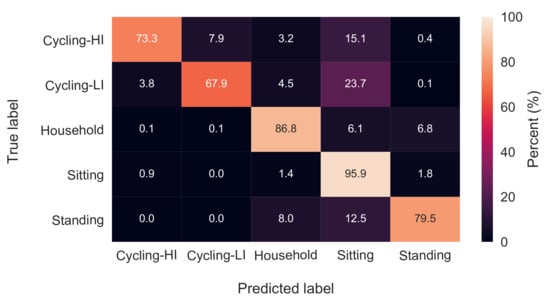 The effect of HR features on classification accuracies was examined using an RF classifier with 64 trees and the feature set with a 13-s window length. The mentioned classifier was once trained and tested while including all the HR and ACC features and another time with only ACC features. The overall accuracy values were 89.6 ± 3.9% and 89.3 ± 3.9% for with-HR and without-HR feature sets, respectively. The classification results are depicted in the two confusion matrices in Figure 3 and Figure 4. There were no significant changes in the classification accuracies of standing, sitting, household activities and low-intensity cycling categories, while the high-intensity cycling was classified with 7% less accuracy when HR features were excluded.