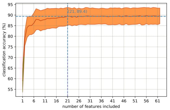 The importance score of the RF classifier for each feature, as described in [7], can be used to determine the optimum number of features required for a proper classification. An RF classifier with 10,000 trees was trained, and feature importance scores were extracted. Deploying 10,000 trees is required to reliably extract feature importance scores [7]. The features were then sorted based on their importance scores descendingly. Next, an RF classifier with 64 trees, as proven in Experiment 2, is trained and tested iteratively by growing the feature set with one feature at a time from the above-mentioned sorted list of features. That is, in the very first iteration, the feature set included just one feature, which has the highest importance score. In the second iteration, the two features with the highest importance scores were included in the feature set. Similarly, the feature set was grown repeatedly with one feature added at a time from the above-mentioned list of sorted features. Figure 5 shows how the overall LOOCV accuracy changed by growing the feature set from Feature Number 1 all the way until Feature Number 62.