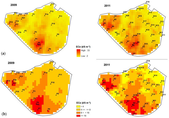 | 4 ≤ ECe < 8 | Moderately saline | 55.1 | 35.0 |