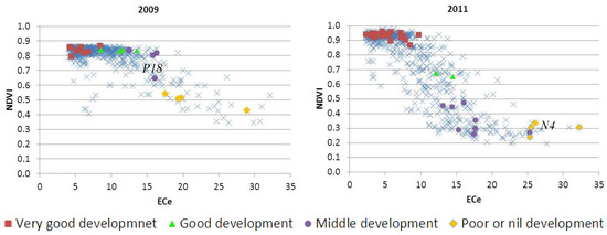 3.3. Relationship between Vegetative Activity and Soil Salinity
