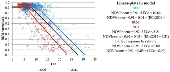 - Amezketa, E.; Urdanoz, V.; Barinagarrementeria, I.; Albizua, L.; Berkane, Y.; Portero, C.; Casterad, M.A. Validación de índices espectrales para detectar salinidad edáfica en cebada mediante sensores electromagnéticos terrestres. In Teledetección: Bosques y Cambio Climático; DL:AS-3588-2011; Recondo, C., Pendás, E., Eds.; XIV Congreso de la Asociación Española de Teledetección: Asturias, Spain, 2011; pp. 277–280. [Google Scholar]