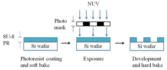 Patterns with more grids increase the length of conductive elastomers. The strain and resistance relations of the CPDMS strain sensors with different patterns were measured. We used SU8 (SU8-2025, TELTEC Semiconductor Pacific, Hsinchu, Taiwan) as the photoresist in strain sensor mold fabrication. Parameters used during fabrication are: rotation speed of 1500 rpm, exposure time of 4.5 s, and development time of 9 min. The mold development process with photolithography is shown in Figure 2. The mold fabrication results are shown in Figure 3.