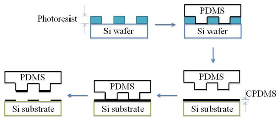 Micropatterning was applied to make CPDMS strain sensors. The fabrication process is shown in Figure 4. First PDMS with a mixing ratio of 10:1 was poured into the silicon mold, degassed in the vacuum oven, and cured at 70 °C. The cured PDMS was peeled off and used as a “stamp”. The PDMS stamp was pressed onto CPDMS mixture on silicon wafers, and then the CPDMS was transferred onto the stamp. After being cured, CPDMS elastomers with different patterns were made and can be used as strain gauge sensors.