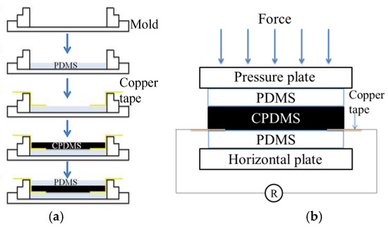 The resistance measurement of CPDMS under different pressures is shown in Figure 5. The CPDMS bulk was protected with two PDMS layers. The sandwich structure was made by curing PDMS, CPDMS, and PDMS layers sequentially, and a conductive copper tape was inserted during curing for resistance measurement (Figure 5a). A universal testing machine (HT-9102, Hung Ta Instrument, Taichung, Taiwan) compressed the CPDMS elastomer in the vertical direction, with a resistance meter (DM-3000, HILA, Taipei, Taiwan) attached on the conductive copper tape (Figure 5b). For electrical conditioning, the carbon particle and PDMS ratio was varied till the measured initial resistances can be measured and are reproducible (n > 3, data not shown). Also, the resistance of measurement was calibrated till the initial resistances of CPDMS were identical. When pressure was exerted by the universal testing machine, we recorded the force, movement, and electric resistance to calculate piezoresistance.