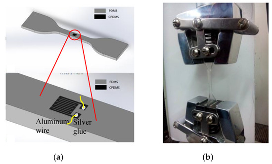 Piezoresistance measurement of (a) CPDMS attached on a strain gauge with (b) universal testing machine.