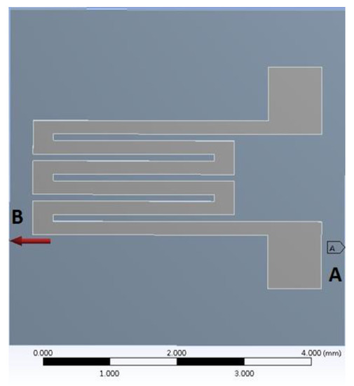 In this study, the stress-strain analysis of the PDMS substrate and CPDMS strain sensor was simulated with ANSYS Workbench 14.0. For PDMS, the density, Young’s modulus, and Poisson’s ratio used were 965.0 kg/m3, 410 kPa, and 0.3, respectively; for CPDMS, the density, Young’s modulus and Poisson ratio were 1290.5 kg/m3, 410 kPa, and 0.3, respectively. Both PDMS and CPDMS Young’s modulus were based on the measurement results mentioned in Section 2.5. The thickness of the PDMS substrate was 1.0 mm and the height of the protruding PDMS structure was 90 μm; the thickness of the CPDMS was measured by optical microscope (DM IL, Leica, Wetzlar, Germany) and was about 30 μm. For boundary conditions, as shown in Figure 7, the right side (A) of the pattern was fixed and 0.2415 MPa tensile stress was exerted on the left side (B). The resulting strain of 0.2415 MPa was 25%.