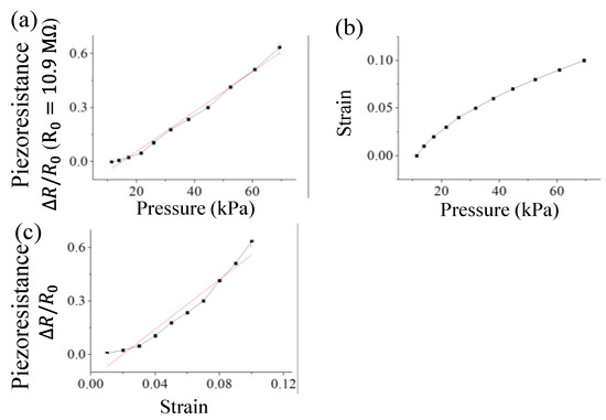 Piezoresistance and strain of CPDMS under different pressure. (a) Piezoresistance to pressure; (b) Strain to pressure; (c) Piezoresistance to strain. The black lines are the measurement results and the red lines are the linear approximation of the measurement results.