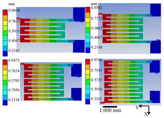 CPDMS strain sensor simulation results are shown in Figure 9. The stretch on the left side (0.93–0.97) is greater than the stretch on the right side (0.21–0.22). The CPDMS strain sensor with more grids has a larger total strain with the same PDMS substrate strain. Therefore, the corresponding resistance change and gauge factor increase with grid number.