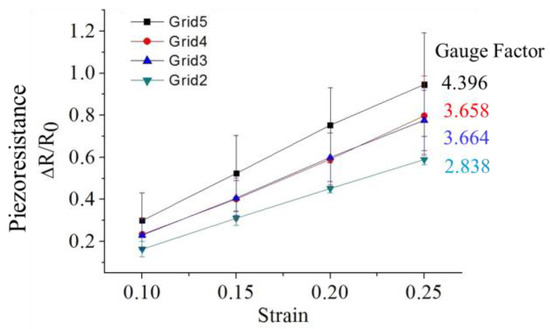 The resistance change and strain rate of CPDMS strain sensor with different amount of grids was measured. The thickness of the CPDMS was 120.0 μm ± 15.7 μm. The measurement results are shown in Figure 10. When the number of grids increased, the gauge factor increased. This is because sensors with more grids have longer CPDMS structures. Hence, resistance change and gauge factor increased with grid number. This result corresponds to results from simulations. The standard deviation of the measured gauge factor was high sine the CPMDS thickness was difficult to control in the CPDMS “stamping” process. The gauge factors were also divided by the number of sensor squares and the normalized gauge factors were calculated (Table 1). The normalized gauge factors are quite similar. The differences might come from the tolerance of gauge factor and the total strain of the sensors was not exactly proportional to the number of sensor squares.
