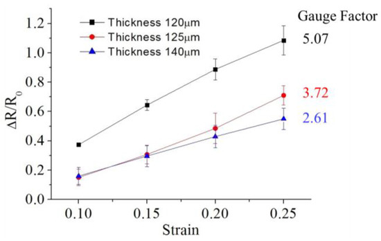 CPDMS strain sensor with five grids was used for thickness experiments. Sensors with different thicknesses were made by embossing two, four and six times, resulting in thicknesses of 120.0 μm ± 15.7 μm, 125.0 μm ± 19.4 μm, and 140.0 μm ± 13.7 μm, respectively. The measurement results are shown in Figure 11. The gauge factor measured of 120.0 μm thick sensor has the highest gauge factor of about 5.070. This result indicates that the thinner CPDMS strain sensor makes the higher gauge factor. This might be because that for thin CPDMS sensors, the amount of conductive particles is less per unit length. Hence, stretching the sensor makes the resistance change larger than that of thick CPDMS sensors.