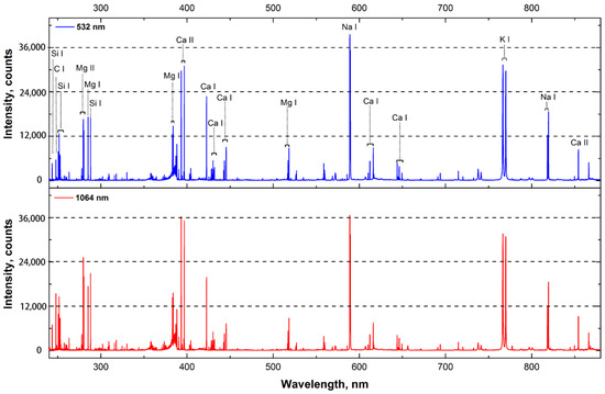 Averaged spectra of sample from extra group (60 μM chromium stress) in the range of 240–880 nm. Experimental parameters of energy, LTSD, delay time, gate width for 532 nm and 1064 nm excitations are 90 mJ, 98 mm, 4 μs and 16 μs, respectively.