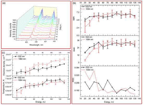 Figure 3a shows the spectral intensity in the range of 424–428 nm with 12 different pulse energies of the laser (532/1064 nm, 8 ns, 1 Hz). The signal intensities for chromium increased with the increase of energy, while they began to flatten in high energy. The variation of background continuum emission was similar to the signal for chromium. The increase of spectral intensity might be related to the greater ablated particle with the increase of fluence (see Figure 4). Figure 3c shows the electron density and plasma temperature with different pulse energies. The electron density in low pulse energy () of 1064 nm excitation was not available, because the emission line used for calculation was disappeared. The electron density and temperature of plasma increased as the increase of energy (see Figure 3c). It indicated that more electrons were generated, and greater energy of photons were absorbed by electrons, which caused the increase of temperature [38]. In addition, when the fluence was low, the RSD were relatively high (Figure 3b). As the fluence used for the samples was around the ablation threshold, the produced plasma was likely unstable.