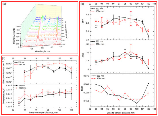Figure 5a shows the spectral intensity in 424–428 nm spectral window with LTSD in the range of 93–102 mm. When the LTSD was larger than 100 mm, the laser ablated the atmosphere. As the increase of LTSD, the signal achieved its maximal values at 98 mm and 99 mm for 532/1064 nm excitations and then decreased. The emissions of chromium might not be directly related with crater’s depth and ablated volume. As seen in Figure 6, the ablated volume and depth decrease, while the emissions increase with the LTSD changes from 93 to 98 mm. Hence, the variance of emission intensity might be credited to the ablation efficiency between laser beam and target, which was related to ablation fluence and ablation spot. As the LTSD increased (), the ablation fluence increased while the ablation spot decreased. The maximal values of signal might indicate the optimized values of LTSD with the largest ablation efficiency, which were based on the trade-off between the fluence and the ablation spot diameter. The trends of SNR and SBR were consistent with that of signal (Figure 5b). For the RSD, it deceased with LTSD from 93 to 100 mm, then it greatly increased. As seen in Figure 5c, the temperature and electron density increased with the increase of LTSD (when it was shorter than 100 mm). It indicated that the used pulse energy with short LTSD might be insufficient to produce enough electrons and maintain high plasma temperature, which induced instability of the signal. For the LTSD larger than the focal length of lens, the laser beam mainly caused the breakdown in the air rather than the samples. In the practical application, it should be strictly avoided. Above all, the optimal LTSD for 532 nm and 1064 nm excitations were 98 mm and 99 mm, respectively.