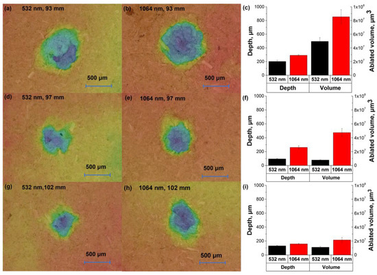 Morphologies of craters with different LTSDs under 532 nm and 1064 nm excitations: (a) 532 nm excitation, LTSD = 93 mm; (b) 1064 nm excitation, LTSD = 93 mm; (d) 532 nm excitation, LTSD = 97 mm; (e) 1064 nm excitation, LTSD = 97 mm; (g) 532 nm excitation, LTSD = 102 mm; (h) 1064 nm excitation, LTSD = 102 mm. The colors in (a,b,d,e,g,h) indicated the depth of craters. Plots of statistic parameters (depth and ablated volume) of craters with different LTSDs: (c) LTSD = 93 mm; (f) LTSD = 97 mm; (i) LTSD = 102 mm.