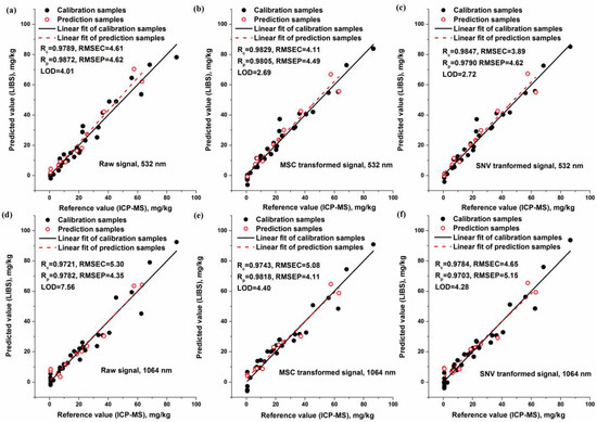 Relationship between reference value and LIBS measured value that calibrated with the variables of (a) raw signal of 532 nm excitation; (b) MSC transformed signal of 532 nm excitation; (c) SNV transformed signal of 532 nm excitation; (d) raw signal of 1064 nm excitation; (e) MSC transformed signal of 1064 nm excitation; (f) SNV transformed signal of 1064 nm excitation. (Rc: R in calibration set, Rp: R in prediction set, RMSEC: RMSE in calibration set, RMSEP: RMSE in prediction set).